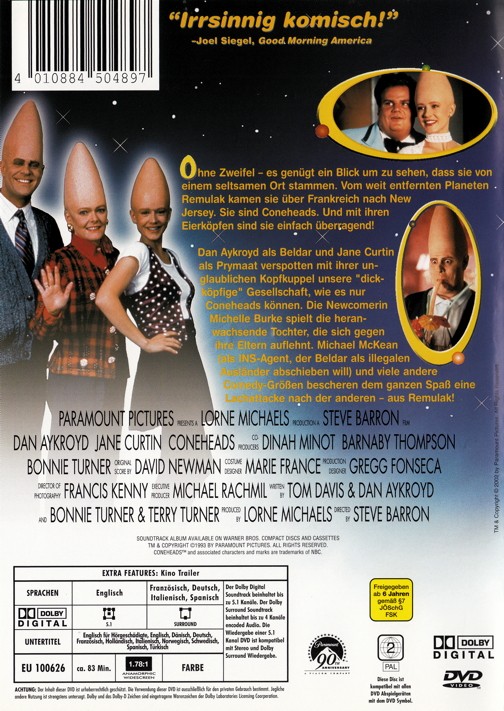 Ohne Zweifel - es genügt ein Blick um zu sehen, dass sie von einem seltsamen Ort stammen. Vom weit entfernten Planeten 'Remulak' kamen sie über Frankreich nach New Jersey. Sie sind die 'Coneheads' und mit ihren Eierköpfen sind sie einfach überragend! Dan Aykroyd als Beldar und Jane Curtin als Prymaat verspotten mit ihrer unglaublichen Kopfkuppel unsere dickköpfige Gesellschaft, wie es nur 'Coneheads' können. Die Newcomerin Michelle Burke spielt die heranwachsende Tochter, die sich gegen ihre Eltern auflehnt. Michael McKean als INS-Agent, der Beldar als illegalen Ausländer abschieben will und viele andere Comedy-Größen bescheren dem ganzen Spaß eine Lachattacke nach der anderen - aus 'Remulak'.