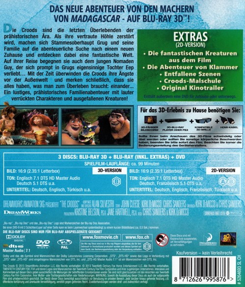 Die Croods sind die letzten Überlebenden der prähistorischen Ära. Als ihre vertraute Höhle zerstört wird, machen sich Stammesoberhaupt Grug und seine Familie auf die abenteuerliche Suche nach einem neuen Zuhause und entdecken dabei eine neue, fantastische Welt. Auf ihrer Reise begegnen sie auch dem jungen Nomaden Guy, der sich prompt in Grugs eigensinnige Tochter Eep verliebt... Mit der Zeit überwinden die Croods ihre Ängste vor der Aussenwelt und merken schliesslich, dass sie alles haben, was man zum Überleben braucht: einander...
