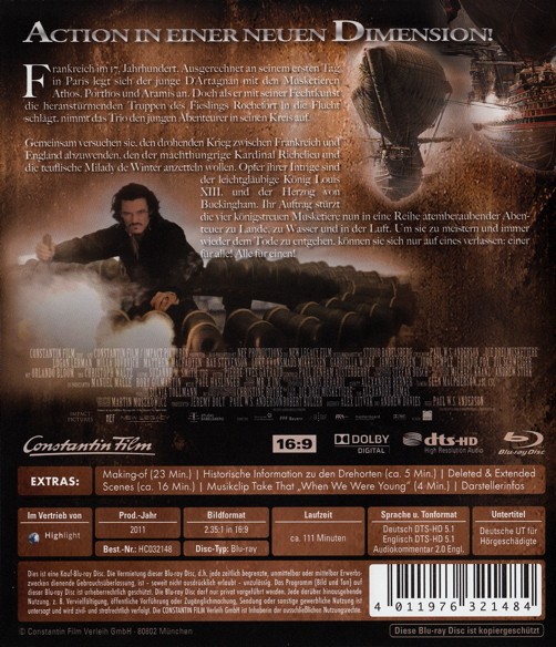 Frankreich im 17. Jahrhundert. Gleich an seinem ersten Tag in Paris legt sich der junge D'Artagnan mit den Musketieren Athos, Porthos und Aramis an. Doch als er mit geschickter Klinge die Truppen des Fieslings Rochefort (Mads Mikkelsen) in die Flucht schlägt, nimmt das Trio den jungen Abenteurer in ihrem Kreis auf.