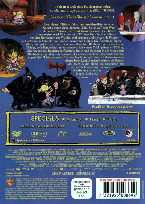 Die kleine Tiffany fährt mutterseelenallein in einer Kutsche durch einen dunklen Wald. Sie ist auf dem Weg in ihr neues Zuhause, ein Kinderhaus, das von einer bösen Tante regiert wird. Plötzlich wird Tiffanys Kutsche überfallen - von den Herrschern des Waldes: drei grimmig drein schauende Räuber mit weiten schwarzen Mänteln und grossen schwarzen Hüten. Die furchtlose, freche Tiffany ist jedoch ganz entzückt von den drei Räubern und wittert ihre Chance, dem Kinderhaus zu entkommen. Mit einem Trick gelingt es Tiffany, sich von den drei Räubern entführen zu lassen und bringt in der Folge deren Räuberleben gehörig durcheinander. Eine abenteuerliche Geschichte um eine sagenhafte Schatzkammer, Tortenschlachten und eine Kinderhausrevolte nimmt ihren Lauf. Am Ende nehmen die Kinder das Heft in die Hand, um zusammen mit den gar nicht mehr so grimmigen Räubern ein echtes Happy-End anzusteuern.