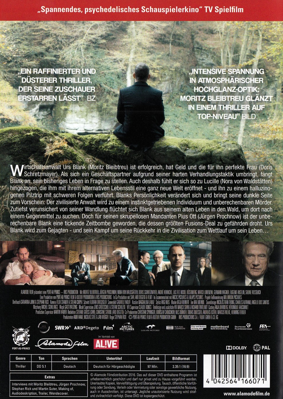 Wirtschaftsanwalt Urs Blank ist der unangefochtene Star auf seinem Gebiet. Er ist erfolgreich, hat Geld und die für ihn perfekte Frau. Als sich ein Geschäftspartner aufgrund seiner harten Verhandlungstaktik umbringt, fängt Urs an, sein bisheriges Leben in Frage zu stellen. Vielleicht auch deshalb fühlt er sich so zu Lucille hingezogen, die ihm mit ihrem alternativen Lebensstil eine ganz neue Welt eröffnet und ihn zu einem Trip mit halluzinogenen Pilzen verführt. Mit schweren Folgen für Blank, denn nach dem Trip verändert sich seine Persönlichkeit und bringt seine dunkle Seite zum Vorschein. Der zivilisierte Anwalt wird zu einem instinktgetriebenen Individuum und unberechenbaren Mörder. Zutiefst verunsichert von seiner Wandlung, flüchtet sich Blank aus seinem alten Leben in den Wald, um dort nach einem Gegenmittel für den missglückten Pilztrip zu suchen. Doch für seinen skrupellosen Mandanten Pius Ott ist der unberechenbare Blank eine tickende Zeitbombe geworden, denn er droht dessen grössten Fusionsdeal zu gefährden. Urs Blank wird zum Gejagten - und sein Kampf um seine Rückkehr in die Zivilisation zum Wettlauf um sein Leben...