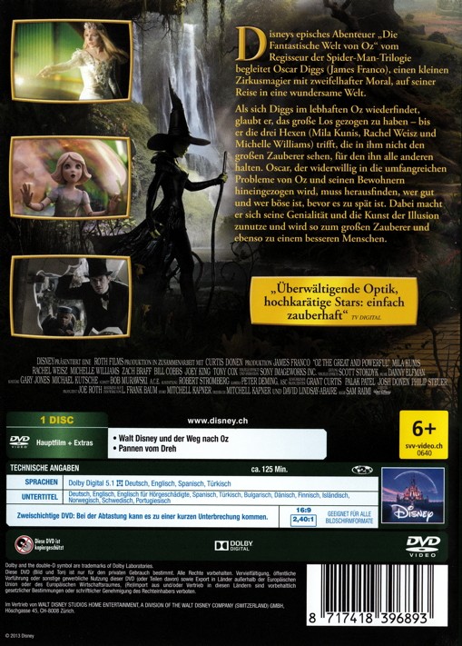 Oscar Diggs (James Franco) ist ein kleiner Zirkusmagier mit fragwürdiger Moral. Als er sich eines Tages nach einem schweren Wirbelsturm in der fantastischen Welt von Oz wiederfindet, denkt er, einen Volltreffer gelandet zu haben. Ruhm und Reichtum scheinen greifbar nah - zumindest bis er den drei Hexen Theodora (Mila Kunis), Evanora (Rachel Weisz) und Glinda (Michelle Williams) begegnet. Die sind nämlich überhaupt nicht davon überzeugt, dass er der grosse Zauberer ist, für den ihn alle halten. Widerstrebend wird Oscar in die Schwierigkeiten von Oz und seinen Bewohnern hineingezogen und muss herausfinden, wer zu den Guten und wer zu den Bösen gehört, bevor es zu spät ist. Mit Illusionen, Einfallsreichtum und auch ein bisschen echter Zauberei schafft es Oscar schliesslich, nicht nur zum grossen und mächtigen Zauberer von Oz zu werden...
