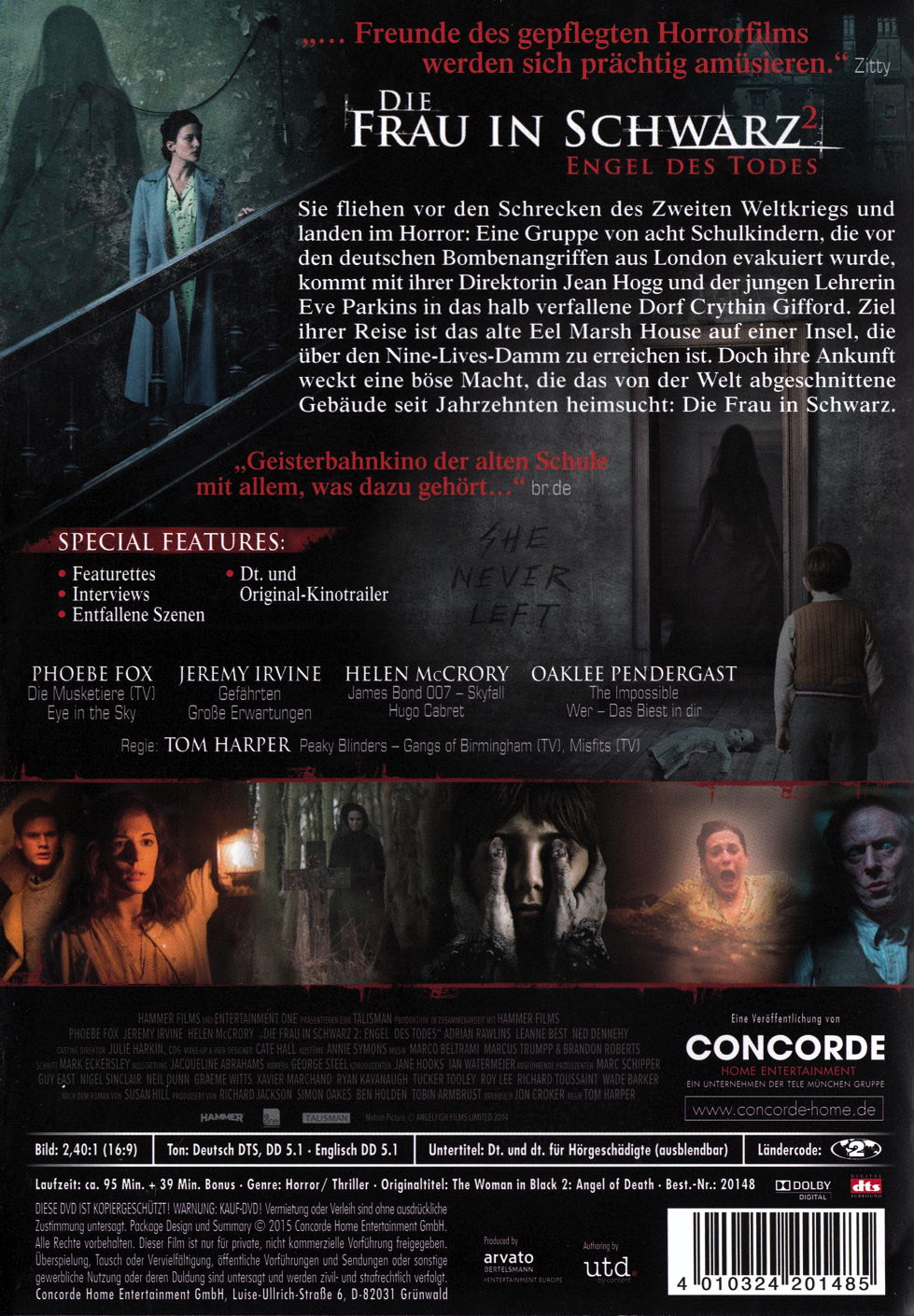 2012 wurde die 'Die Frau in Schwarz', die Verfilmung von Susan Hills Schauerroman mit Daniel Radcliffe in der Hauptrolle, zur Gruselkino-Sensation. Nun entwickelte die Bestsellerautorin ein Konzept, das diese Geschichte konsequent und innovativ weiterführt. In 'Die Frau in Schwarz 2 - Engel des Todes' erreicht der schauerromantische Horror einen neuen Höhepunkt. Regisseur Tom Harper, der sich unter anderem mit den Serien 'Peaky Blinders - Gangs of Birmingham' und 'Misfits' (2009-2010) einen Namen im englischen Fernsehen machte, standen dafür aufregende Newcomer wie Phoebe Fox ('Die Musketiere') oder Jeremy Irvine ('Gefährten') zur Verfügung, aber auch erfahrene Darstellerinnen wie Helen McCrory ('James Bond 007 - Skyfall'). Das Drehbuch nach Hills Vorlage verfasste Jon Croker ('Wüstentänzer - Afshins verbotener Traum von Freiheit').
