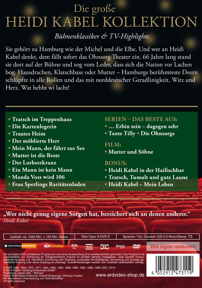 Sie gehört zu Hamburg wie der Michel und die Elbe. Und wer an Heidi Kabel denkt, dem fällt sofort das Ohnsorg-Theater ein. 66 Jahre lang stand sie dort auf der Bühne und zog vom Leder, dass sich die Nation vor Lachen bog. Hausdrachen, Klatschbase oder Mutter - Hamburgs berühmteste Deern schlüpfte in alle Rollen und das mit norddeutscher Geradlinigkeit, Witz und Herz. Wat hebbt wi lacht! Bühnenklassiker aus dem Ohnsorg-Theater: Tratsch im Treppenhaus (1966) Die Kartenlegerin (1968) Trautes Heim (1970) Der möblierte Herr (1971) Mein Mann, der fährt zur See (1971) Mutter ist die Beste (1980) Der Lorbeerkranz (1983) Ein Mann ist kein Mann (1983) Manda Voss wird 106 (1992) Frau Sperlings Raritätenladen (1998) TV-Highlights: Serien - Das Beste aus: ...Erbin sein - dagegen sehr Tante Tilly und Die Ohnsorgs Film Mutter und Söhne Inkl. 150 Min. Bonus