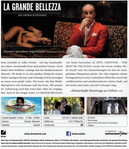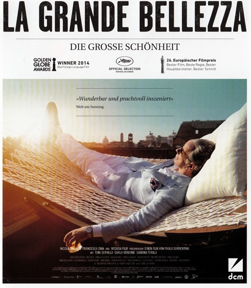 Es ist Sommer. Rom erstrahlt in voller Pracht: schön und verführerisch. Wie Jep Gambardellas Leben - rauschende Feste, Gourmet-Restaurants und schöne Frauen. Doch hinter dem Verführer verbirgt sich ein desillusionierterMensch, den die Oberflächlichkeit der opulenten Gesellschaft langweilt. Oft denkt er an seine literarische Arbeit, die ihm in seiner Jugend den großen Erfolg für seinen bisher einzigen Roman eingebracht hat. Außerdem schwelgt er in Erinnerungen an seine erste große Liebe. Die Leere, die ihm bleibt, überspielt er mit Zynismus und Gin Tonic. Mitseinem 65. Geburtstag wird ihm eines klar: Alles ist vergänglich. Auch in der ewigen Stadt.
