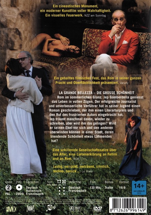 Es ist Sommer. Rom erstrahlt in voller Pracht: schön und verführerisch. Wie Jep Gambardellas Leben - rauschende Feste, Gourmet-Restaurants und schöne Frauen. Doch hinter dem Verführer verbirgt sich ein desillusionierterMensch, den die Oberflächlichkeit der opulenten Gesellschaft langweilt. Oft denkt er an seine literarische Arbeit, die ihm in seiner Jugend den grossen Erfolg für seinen bisher einzigen Roman eingebracht hat. Ausserdem schwelgt er in Erinnerungen an seine erste grosse Liebe. Die Leere, die ihm bleibt, überspielt er mit Zynismus und Gin Tonic. Mitseinem 65. Geburtstag wird ihm eines klar: Alles ist vergänglich. Auch in der ewigen Stadt.