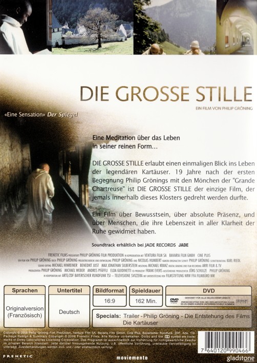 "Die grosse Stille" ist ein Film über die „Grande Chartreuse“, das Mutterkloster des legendären Schweigeordens: die Karthäuser. 19 Jahre nach der ersten Begegnung des Regisseurs Philip Gröning mit dem Prior des Klosters ist es der erste Film, der jemals über das Leben hinter den Klostermauern gedreht werden durfte.