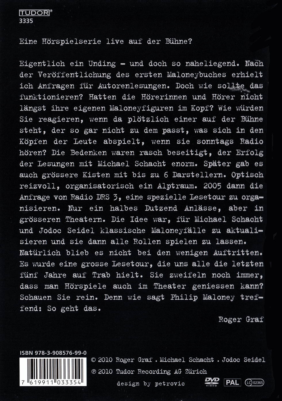 Eine Hörspielserie auf der Bühne? Eigentlich ein Unding - und doch so naheliegend. Nach der Veröffentlichung des ersten Maloneybuches erhielt ich Anfragen für Autorenlesungen. Doch wie sollte das funktionieren? Hatten Hörerinnen und Hörer nicht längst ihre eigenen Maloneyfiguren im Kopf? Wie würden Sie reagieren, wenn da plötzlich einer auf der Bühne steht, der so gar nicht zu dem passt, was sich in den Köpfen der Leute abspielt, wenn sie sonntags Radio hören? Die Bedenken waren beseitigt, der Erfolg der Lesungen mit Michael Schacht enorm. Später gab es auch grössere Kisten mit bis zu 6 Darstellern. Optisch reizvoll, organisatorisch ein Alptraum. 2005 denn die Anfrage von Radio DRS 3, eine spezielle Lesetour zu organisieren. Nur ein halbes Dutzend Anlässe, aber in grösseren Theatern. Die Idee war, für Michael Schacht und Jodoc Seidel klassische Maloneyfälle zu aktualisieren und sie dann alle Rollen spielen zu lassen. Natürlich blieb es nicht bei den wenigen Auftritten. Es wurde eine grosse Lesetour, die uns alle seit Jahren auf Trab hält. Sie zweifeln noch immer, dass man Hörspiele auch im Theater geniessen kann? Schauen Sie rein. Denn wie sagt Philip Maloney treffend: So geht das!