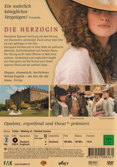Ihre Abenteuer- und Lebenslust machte sie zum It-Girl des 18. Jahrhunderts: Georgiana Spencer wird jung von ihrer Mutter mit dem einflussreichen Herzog von Devonshire verheiratet. Allen gesellschaftlichen Konventionen zum Trotz steigt die temperamentvolle Frau schnell zur politischen Aktivistin und umjubelten Fashion-Ikone auf. Doch obwohl ihr ringsum die Herzen zufliegen, fühlt sie sich mehr und mehr gefangen in ihrer Ehe mit dem hartherzigen Aristokraten. Er verlangt von ihr einen männlichen Erben, ansonsten bevorzugt er Lady Bess, die beste Freundin seiner Frau. Gedemütigt engagiert sich Georgina gesellschaftlich umso mehr und avanciert zum Mittelpunkt der High Society. Da begegnet sie dem aufstrebenden Jungpolitiker Charles Grey...