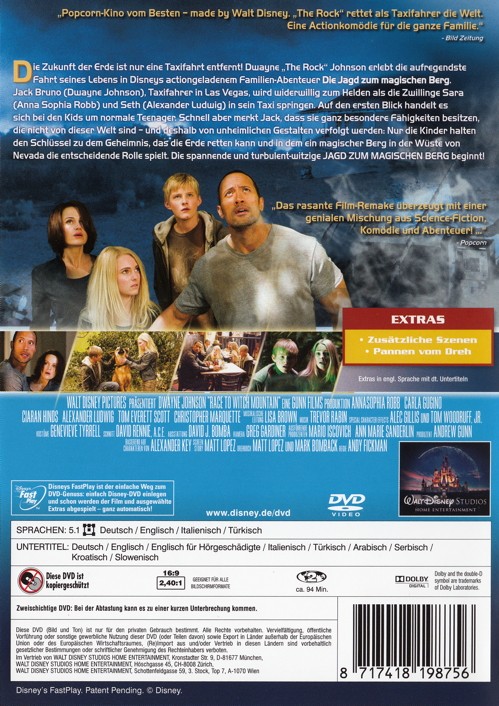 Jack Bruno (Dwayne Johnson), Taxifahrer in Las Vegas, wird widerwillig zum Helden als die Zwillinge Sara (AnnaSophia Robb) und Seth (Alexander Ludwig) in sein Auto springen. Auf den ersten Blick handelt es sich bei den Kids um normale Teenager. Schnell aber merkt Jack, dass sie ganz besondere Fähigkeiten besitzen, die nicht von dieser Welt sind - und deshalb von unheimlichen Gestalten verfolgt werden: Nur die Kinder halten den Schlüssel zu dem Geheimnis, das die Erde und ihren Planeten retten kann und in dem ein magischer Berg in der Wüste von Nevada die entscheidende Rolle spielt. Die spannende, actiongeladene und turbulent-witzige JAGD ZUM MAGISCEN BERG beginnt!
