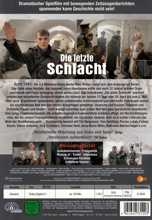 Das Dokudrama "Die letzte Schlacht" zeichnet die Geschichte von 13 Tagen nach, die in der Historie Deutschlands einzigartig sind: Es geht um die Zeit vom 20. April bis zum 2. Mai 1945. Diese Tage spiegeln den letzten Akt in der Geschichte eines Reichs, das tausend Jahre dauern sollte und nach und nach zwölf in einer Orgie von Gewalt und Feuer unterging.