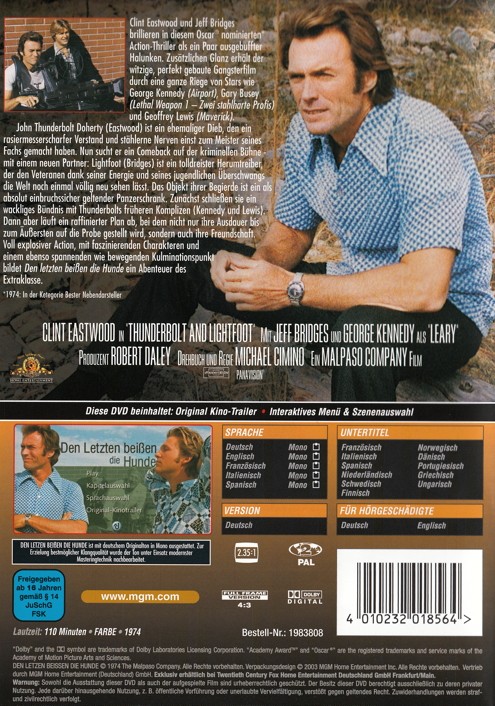 John Thunderbolt Doherty ist ein ehemaliger Dieb, den ein rasiermesserscharfer Verstand und stählerne Nerven einst zum Meister seines Fachs gemacht haben. Nun sucht er ein Comeback auf der kriminellen Bühne - mit einem neuen Partner: Lightfoot ist ein tolldreister Herumtreiber, der den Veteranen dank seiner Energie und seines jugendlichen Überschwangs die Welt noch einmal völlig neu sehen lässt. Das Objekt ihrer Begierde ist ein als absolut einbruchssicher geltender Panzerschrank. Zunächst schliessen sie ein wackliges Bündnis mit Thunderbolts früheren Komplizen. Dann aber läuft ein raffinierter Plan ab, bei dem nicht nur ihre Ausdauer bis zum Äussersten auf die Probe gestellt wird, sondern auch ihre Freundschaft. Voll explosiver Action, mit faszinierenden Charakteren und einem ebenso spannenden wie bewegenden Kulminationspunkt bildet "Den letzten beissen die Hunde" ein Abenteuer der Extraklasse.