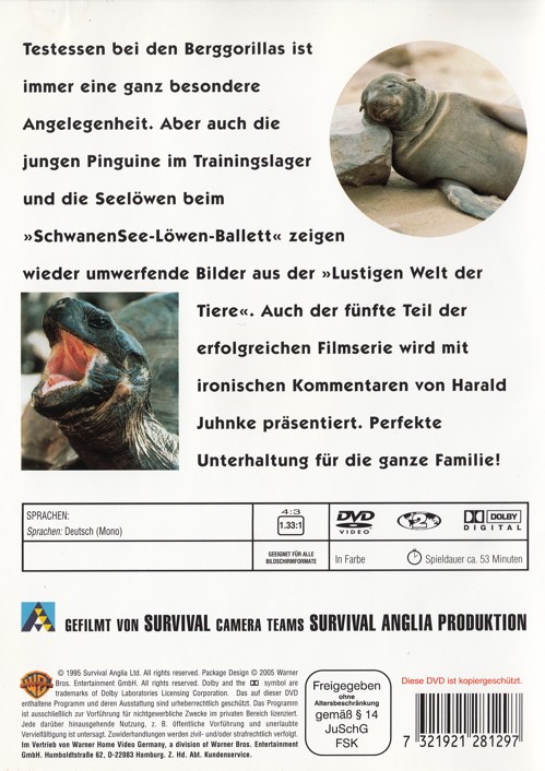 Testessen bei den Berggorillas ist immer eine ganz besondere Angelegenheit. Aber auch die jungen Pinguine im Trainingslager und die Seelöwen beim "Schwanensee-Löwen-Ballett" zeigen wieder umwerfende Bilder aus der "Lustigen Welt der Tiere". Auch der fünfte Teil der erfolgreichen Filmserie wird mit ironischen Kommentaren von Harald Junke präsentiert. Perfekte Unterhaltung für die ganze Familie!