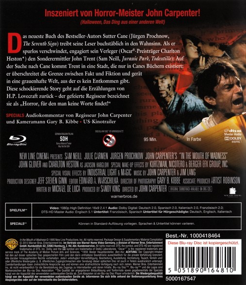 John Trent (Sam Neill:"Jurassic Park") ist Versicherungsdetektiv, ein Meister im Aufspüren von Fälschungen und Betrügereien. Eines Tages wird er beauftragt, den vermissten Horror-Schriftsteller Sutter Cane (Jürgen Prochnow: "Beverly Hills Cop II") zu suchen. Trent wittert sofort einen Versicherungsbetrug, denn der smarte Verleger Jackson Harglow (Charlton Heston: "True Lies") und seine hübsche Lektorin Linda profitieren mächtig vom Verschwinden ihres Starautors: es bringt Cannes, noch unvollendetem Roman "Die Mächte des Wahnsinns", der von Millionen Fans mit Spannung erwartet wird, noch zusätzliche Publicity ein.