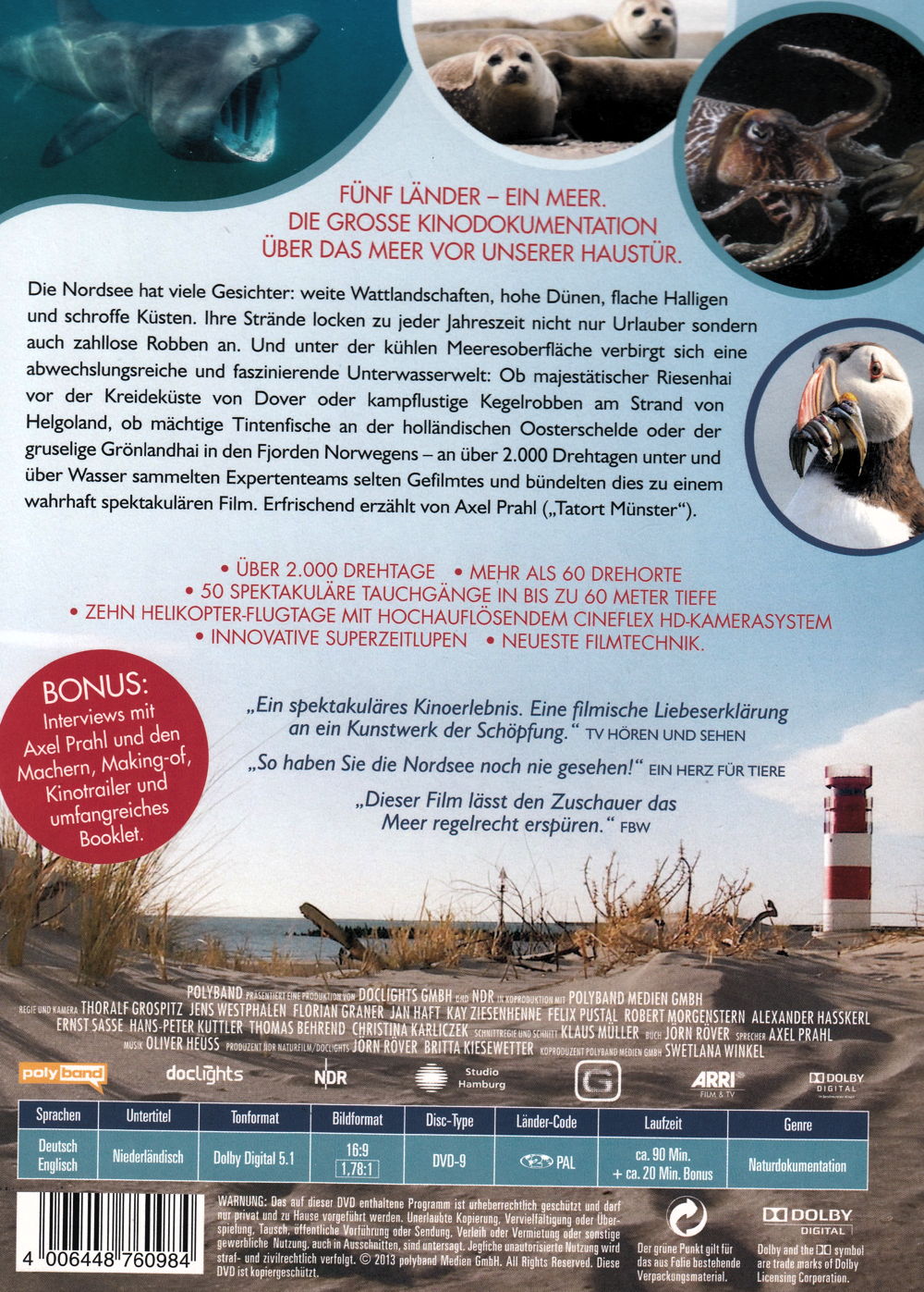 Die Nordsee, das grösste Meer vor unserer Haustür, hat viele Gesichter: weite Wattlandschaften, hohe Dünen, flache Halligen und schroffe Küsten. Ihre Strände locken zu jeder Jahreszeit nicht nur Urlauber sondern auch zahllose Robben an. Und unter der kühlen Meeresoberfläche verbirgt sich eine abwechslungsreiche und faszinierende Unterwasserwelt: Ob majestätischer Riesenhai vor der Kreideküste von Dover oder kampflustige Kegelrobben am Strand von Helgoland, ob mächtige Tintenfische an der holländischen Oosterschelde oder der gruselige Grönlandhai in den Fjorden Norwegens - an über 2.000 Drehtagen unter und über Wasser sammelten Expertenteams selten Gefilmtes und bündelten dies zu einem wahrhaft spektakulären Film: Die Nordsee - Unser Meer. Erfrischend erzählt von Axel Prahl. Über 2.000 Drehtage, mehr als 60 Drehorte, 50 spektakuläre Tauchgänge in bis zu 60 Meter Tiefe, zehn Helikopter-Flugtage mit hochauflösendem Cineflex HD-Kamerasystem, innovative Superzeitlupen, neueste Filmtechnik.