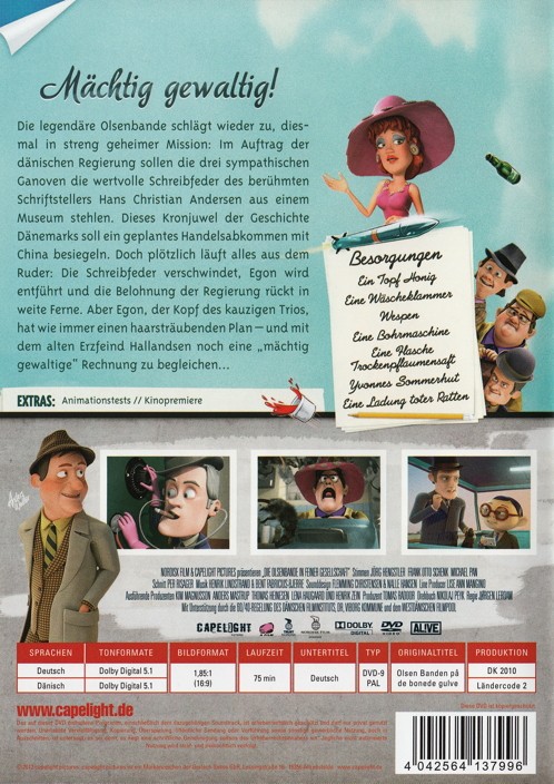 Die legendäre Olsenbande schlägt wieder zu, diesmal in streng geheimer Mission. Im Auftrag der dänischen Regierung sollen die drei sympathischen Ganoven die wertvolle Schreibfeder des berühmten Schriftstellers Hans Christian Andersen aus einem Museum stehlen. Dieses Kronjuwel der Geschichte Dänemarks soll ein geplantes Handelsabkommen mit China besiegeln. Doch plötzlich läuft alles aus dem Ruder. Die Schreibfeder verschwindet, Egon wird entführt und die Belohnung der Regierung rückt in weite Ferne. Aber Egon, der Kopf des kauzigen Trios, hat wie immer einen haarsträubenden Plan und mit dem alten Erzfeind Hallandsen noch eine 'mächtig gewaltige' Rechnung zu begleichen...