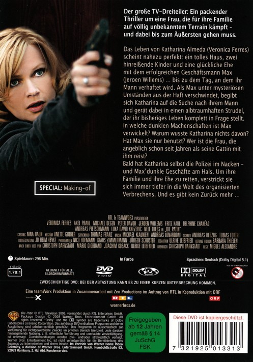 "Die Patin" erzählt die dramatische Geschichte einer Frau und ihrer Familie, deren Existenz von einem Tag auf den anderen in einen gefährlichen Strudel gerät und dabei ihr bisheriges Leben komplett auf den Kopf stellt. Nichts ist mehr wie es war, bzw. zu sein schien. Dabei gerät Katharina Almeda in eine Welt der illegalen Geschäfte, internationaler Kriminalität und skrupelloser Strippenzieher, in der sie niemand mehr trauen kann: Als ihr Mann eines Tages von der Polizei verhaftet wird, muss Katharina seine Geschäfte weiter führen. Doch welche Art Geschäfte waren das? Wirklich organisiertes Verbrechen und Drogenhandel, wie sich bald herauskristallisiert? Hatte er tatsächlich Kontakte zur Mafia in Italien? Oder war sein Doppelleben ebenfalls nur fingiert und er agierte als Undercover Cop im Namen der Polizei? Katharina weiß nicht, was sie glauben soll, sie weiß nur, dass sie für ihre Familie kämpfen muss! Internationale Produktion mit Schauplätzen in Genf, Moskau und Paris mit einer Veronica Ferres in Höchstform. Der RTL-Top-Movie-Dreiteiler jetzt auf DVD.