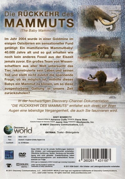 Im Jahr 2004 wurde in einer Goldmine im eisigen Ostsibirien ein sensationeller Fund getätigt: Ein mumifiziertes Mammutbaby! Rund 40.000 Jahre alt und so gut erhalten wie kein anderes Fossil aus der Eiszeit jemals zuvor. Ein grosses Team von Wissenschaftlern aus aller Welt untersuchte das Tier, rekonstruierte sein Leben und seinen Tod und stellt nicht zuletzt die spannende Frage, ob es möglich ist, mithilfe dieses Babys ein Mammut zu klonen und so die ausgestorbene Gattung in unsere Zeit zurückzuholen?