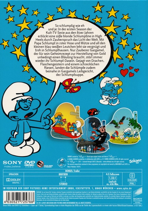 So schlumpfig wie eh und je: In der ersten Season der Kult-TV-Serie aus den 80er Jahren erblickt eine süsse blonde Schlumpfine in High Heels durch Zauberspruch das Licht der Welt. Mit Papa Schlumpf in roter Hose und Mütze und all den kleinen blau-weißen Leutchen lebt sie vergnügt und froh in Schlumpfhausen. Nur Zauberer Gargamel, der für sein Geheimrezept zur Herstellung von Gold unbedingt einen Bläuling braucht, stört immer wieder ihr Schlumpf-Dasein. Gejagt von Drachen, Flaschengeistern und einem schrecklichen Riesen, landen die Schlümpfe zudem beinahe in Gargamels Leibgericht, der Schlumpfsuppe.