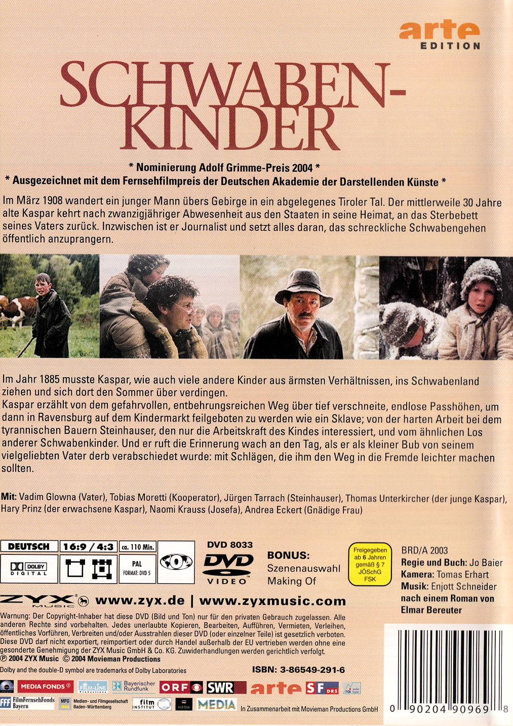 Im Jahr 1885 musste Kaspar, wie auch viele andere Kinder aus ärmsten Verhältnissen ins Schwabenland ziehen und sich dort den Sommer über verdingen. Kaspar erzählt von dem gefahrvollen, entbehrungsreichen Weg über tief verschneite, endlose Passhöhen, um dann in Ravensburg auf dem Kindermarkt feilgeboten zu werden wie ein Sklave; von der harten Arbeit bei dem tyrannischen Bauern Steinhauser, den nur die Arbeitskraft des Kindes interessiert, und vom ähnlichen Los anderer Schwabenkinder. Und er ruft die Erinnerung wach an den Tag, als er als kliener Bub von seinem vielgeliebten Vater derb verabschiedet wurde: mit schlägen, die ihm den Weg in die Fremde leichter machen sollten.