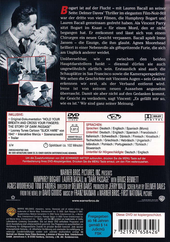 Bogart ist auf der Flucht - mit Lauren Bacall an seiner Seite: Delmer Daves' Thriller im eleganten Film-Noir-Stil war der dritte von vier Filmen, die Humphrey Bogart und Lauren Bacall gemeinsam gedreht haben. Als Vincent Parry sitzt Bogart im Knast - für einen Mord, den er nicht begangen hat. Er entkommt und lässt sich von einem Chirurgen ein neues Gesicht verpassen. Bacall spielt Irene Jansen - die einzige, die ihm glaubt. Agnes Moorehead brilliert in einer Nebenrolle als giftspritzende Furie, die sich am Unglück anderer weidet.