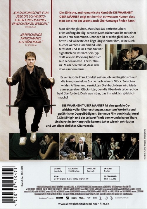 Mads und Marie sind seit zehn Jahren ein Paar. Als sie zusammenziehen und Marie sich ein Kind von Mads wünscht, scheint das Glück perfekt. Doch die "traute" Zweisamkeit wird durch Mads plötzlich aufkommende Zweifel zerstört. Mads schmeisst alles hin und trennt sich von Marie, um seine noch offenen Träume zu erfüllen, die Richtige zu finden und den Sinn des Lebens zu entdecken. "Die Wahrheit über Männer - eine anti-romantische Komödie" ist eine bewegende und herzlich schwarze Komödie über Männer, den Sinn des Lebens, Träume und Liebe.