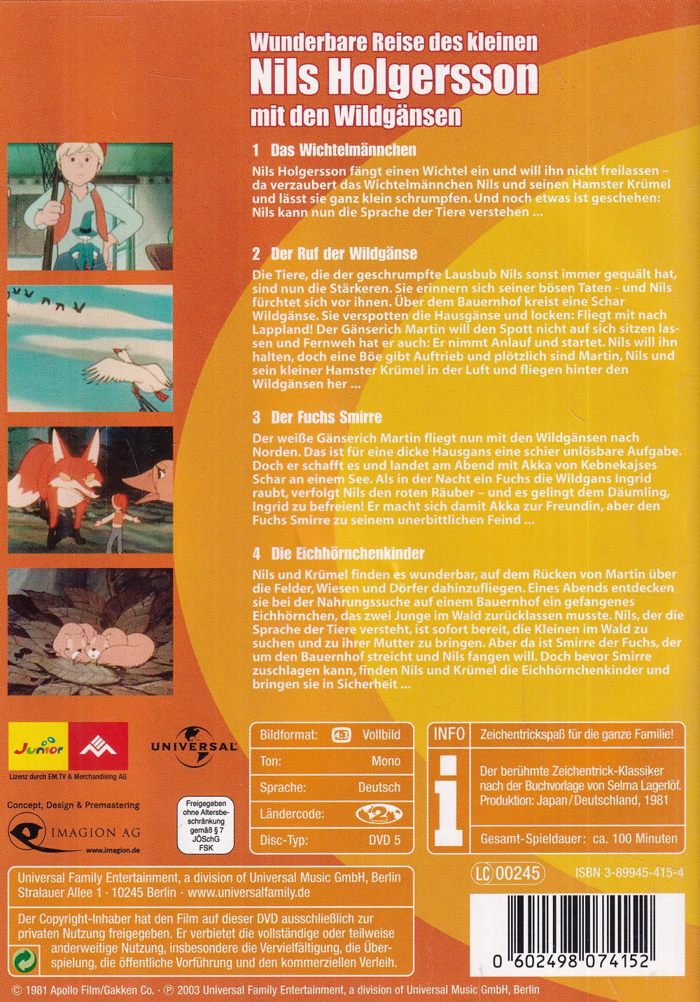 04 Die Eichhörnchenkinder Nils und Krümel finden es wunderbar, auf dem Rücken von Martin über die Felder, Wiesen und Dörfer dahinzufliegen. Eines Abends entdecken sie bei der Nahrungssuche auf einem Bauernhof ein gefangenes Eichhörnchen, das zwei Junge im Wald zurücklassen musst. Nils, der die Sprache der Tiere versteht, ist sofort bereit, die Kleinen im Weld zu suchen und zu ihrer Mutter zu bringen. Aber da ist Smirre der Fuchs, der um den Bauernhof streicht und Nils fangen will. Doch bevor Smirre zuschlagen kann, finden Nils und Krümel die Eichhörnchenkinder und bringen sie in Sicherheit..."