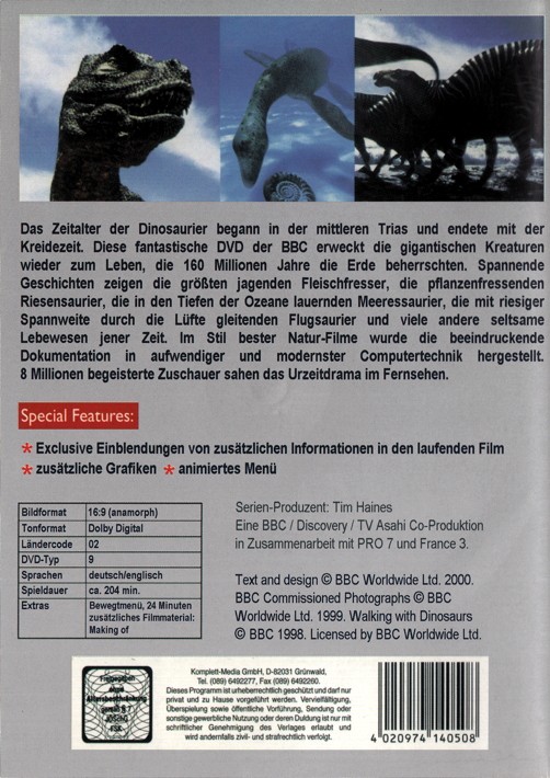 Das Zeitalter der Dinosaurier begann in der mittleren Trias und endete mit der Kreidezeit. Diese fantastische DVD erweckt die Kreaturen wieder zum Leben, die 160 Millionen Jahre die Erde beherrschten. Spannende Geschichten zeigen die grössten jagenden Fleischfresser, die pflanzenfressenden Riesensaurier, die in die Tiefen der Ozeane lauernden Meeressaurier, die mit riesiger Spannweite durch die Lüfte gleitenden Flugsaurier und viele andere seltsame Lebewesen jener Zeit. Im Stil bester Natur-Filme wurde die beeindruckende Dokumentation in aufwendiger und modernster Computertechnik hergestellt. 8 Millionen begeisterte Zuschauer sahen das Urzeitdrama im Fernsehen.
