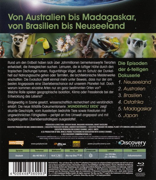 Von Australien bis Madagaskar, von Brasilien bis Neuseeland: Rund um den Erdball haben sich über Jahrmillionen bemerkenswerte Tierarten entwickelt, die ihresgleichen suchen. Lemuren, die in luftiger Höhe durch den tropischen Dschungel turnen, flugunfähige Vögel, die im Schutz der Dunkelheit auf Nahrungssuche gehen oder Termiten, die architektonische Meisterwerke erschaffen: Die Evolution stellt einmal mehr unter Beweis, dass nur der am besten Angepasste eine Überlebenschance auf unserem Planeten hat. Doch warum kommen einzelne Arten nur an ganz bestimmten Orten vor? Welche Rolle spielen geographische Isolation, Klima oder Fressfeinde bei der Entwicklung des Lebens? Bildgewaltig in Szene gesetzt, wissenschaftlich recherchiert und verständlich erklärt: Die neue Wildlife-Dokumentarserie "Wunderwelt Erde" zeigt skurrile Geschöpfe, vom Aussterben bedrohte Tiere sowie Kreaturen mit ungewöhnlichen Fähigkeiten - perfekt an ihre Umwelt angepasst und mit ausgeklügelten Überlebensstrategien ausgestattet.