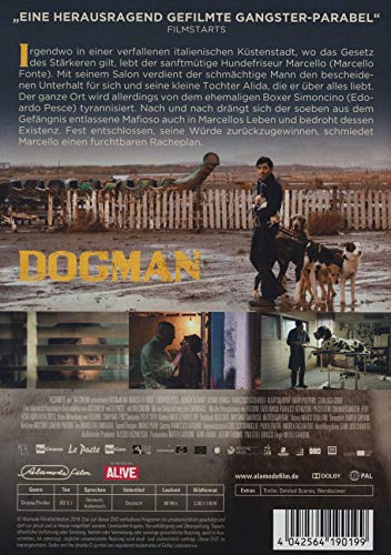Irgendwo in einer verfallenen italienischen Küstenstadt, wo das Gesetz des Stärkeren gilt, lebt der sanftmütige Hundefriseur Marcello (Marcello Fonte). Mit seinem Salon verdient der schmächtige Mann den bescheidenen Unterhalt für sich und seine kleine Tochter Alida, die er über alles liebt. Der ganze Ort wird allerdings von dem ehemaligen Boxer Simoncino (Edoardo Pesce) tyrannisiert. Nach und nach drängt sich der soeben aus dem Gefängnis entlassene Mafioso auch in Marcellos Leben und bedroht dessen Existenz. Fest entschlossen, seine Würde zurückzugewinnen, schmiedet Marcello einen furchtbaren Racheplan. DOGMAN ist eine düstere Parabel über die desolate Lage im heutigen Italien. Regisseur Matteo Garrone (GOMORRHA) erzählt die universelle Geschichte von einem guten Mann, der dem Bösen verfällt, zugleich fesselnd und sehr berührend vor einer faszinierenden süditalienischen Landschaft. In der Hauptrolle ein herausragender Marcello Fonte, der für diese Rolle beim Filmfestival in Cannes als bester Darsteller ausgezeichnet wurde.