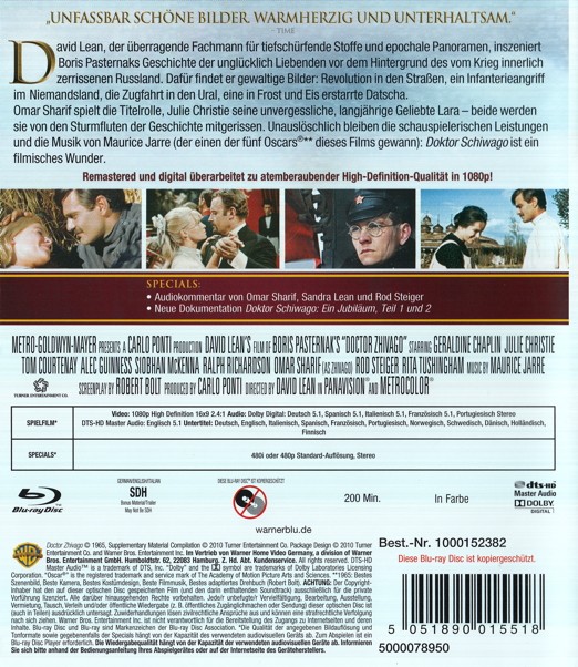 "Dr.Schiwago", der größte Kassenerfolg der 60er Jahre, avancierte zum Klassiker der Filmgeschichte. Es ist die dramatische Geschichte eines Dichters und Arztes vor dem Hintergrund der russischen Revolution und der unbändigen Liebe zu seiner Frau. Regisseur David Lean inszenierte in faszinierenden, monumentalen Stimmungsbildern ein Kinodrama voller dramatischer Momente, das Millionen Menschen zu Tränen rührte und zu dem Robert Bolt das Drehbuch verfaßte. Omar Sharif, Julie Christie, Geraldine Chaplin und Alec Guinness sind in den Hauptrollen ebenso unvergessen wie die sensationelle Musik von Maurice Jarre.