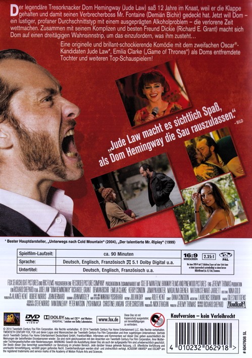Der legendäre Tresorknacker Dom Hemingway (Jude Law) sass 12 Jahre im Knast, weil er die Klappe gehalten und damit seinen Verbrecherboss Mr. Fontaine (Demian Bichir) gedeckt hat. Jetzt will Dom - ein lustiger, profaner Durchschnittstyp mit einem ausgeprägten Alkoholproblem - die verlorene Zeit wettmachen. Zusammen mit seinem Komplizen und besten Freund Dickie (Richard E. Grant) macht sich Dom auf einen dreitägigen Wahnsinnstrip, um das einzufordern, was ihm zusteht...