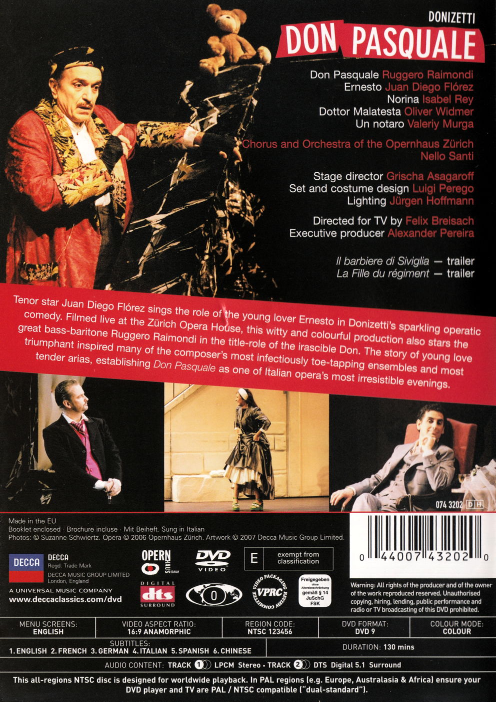 Decca presents Florez once more in one of his great stage roles with this performance of Donizetti's irresistible comedy filmed at the Zurich Opera House. The title role of the irascible Don Pasquale is sung by the great Italian bass, Ruggero Raimondi (who famously played Mozart's Don Giovanni in Joseph Losey's classic 1978 film). A largely traditional but creative, fun production of a classic. Extras include trailers from the DVD release of two operas that also feature Florez, "Il barbiere di Siviglia" and from "La Fille du Regiment" featuring the song "Oh Mes Amis".