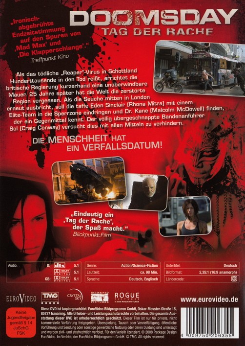 Glasgow 2008: Ein tödliches Virus, "The Reaper" genannt, hat Hunderttausende von Menschen befallen. Um eine Pandemie zu verhindern, wird Schottland gnadenlos sich selbst überlassen und vom Rest der Welt isoliert.