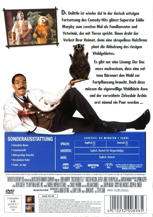 Dr. Dolittle ist wieder da! In der tierisch witzigen Fortsetzung des Comedy-Hits glänzt Superstar Eddie Murphy zum zweiten Mal als Familienvater und Veterinär, der mit Tieren spricht. Ihnen droht der Verlust ihrer Heimat, denn eine skrupellose Holzfirma plant die Abholzung des riesigen Waldgebietes. Es gibt nur eine Lösung: Der Doc muss nachweisen, dass eine seltene Bärenart den Wald zur Fortpflanzung braucht. Doch dazu müssen die eigenwillige Waldbärin Awa und der verwöhnte Zirkusbär Archie erst einmal ein Paar werden.