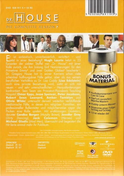 Er ist sarkastisch, unverbesserlich, verbittert - und jetzt in einer Beziehung? Hugh Laurie kehrt in 23 Episoden der siebten Staffel von "Dr. House" mit jener Rolle zurück, die ihm bislang fünf Nominierungen für den Primetime Emmy und zwei Golden Globes bescherte. Dr. Gregory House hat in seiner Karriere schon viele scheinbar hoffnungslose Fälle gelöst, aber als aus seinem beruflichen Verhältnis zu Dr. Lisa Cuddy (Lisa Edelstein) auch eine private Beziehung wird, sieht er sich mit neuen - und sehr unterschiedlichen - Herausforderungen konfrontiert. Sein Team am Princeton-Plainsboro Teaching Hospital (Omar Epps, Jesse Spencer, Peter Jacobson, Robert Sean Leonard, Amber Tamblyn und Olivia Wilde) untersucht derweil weiterhin verblüffende, medizinische Fälle, in denen ein religiöser Fanatiker, ein professioneller Bullenreiter und möglicherweise sogar die Pocken eine Rolle spielen. Mit erstklassigen Gaststars, darunter Candice Bergen (Murphy Brown), Jennifer Grey (Dirty Dancing), Jack Coleman (Heroes) und Michael Gladis (Mad Men), überrascht und begeistert die Hit-Serie einmal mehr ihr Publikum.