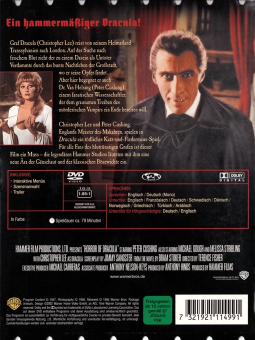 Graf Dracula Christopher Lee reist von seinem Heimatland Transsylvanien nach London. Auf der Suche nach frischem Blut zieht der zu einem Dasein als Untoter verdammte durch das bunte Nachtleben der Großstadt, wo er seine Opfer findet. Aber hier begegnet er auch Dr. Van Helsing Peter Cushing, einem fanatischen Wissenschaftler, der dem grausamen Treiben des mörderischen Vampirs ein Ende bereiten will. Christopher Lee und Peter Cushing, Englands Meister des Makabren, spielen in Dracula ein tödliches Katz-und-Fledermaus-Spiel. Für alle Fans des blutrünstigen Grafen ist dieser Film ein Muss - die legendären Hammer Studios läuteten mit ihm eine neue Ära der Gänsehaut und der klassischen Bösewichte ein.