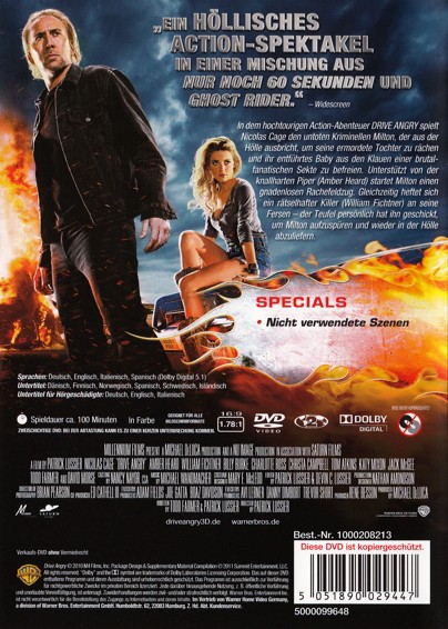 In dem hochtourigen Action-Abenteuer DRIVE ANGRY spielt Nicolas Cage den untoten Kriminellen Milton, der aus der Hölle ausbricht, um seine ermordete Tochter zu rächen und ihr entführtes Baby aus den Klauen einer brutal-fanatischen Sekte zu befreien. Unterstützt von der knallharten Piper (Amber Heard) startet Milton einen gnadenlosen Rachefeldzug. Gleichzeitig heftet sich ein rätselhafter Killer (William Fichtner) an seine Fersen - der Teufel persönlich hat ihn geschickt, um Milton aufzuspüren und wieder in der Hölle abzuliefern.