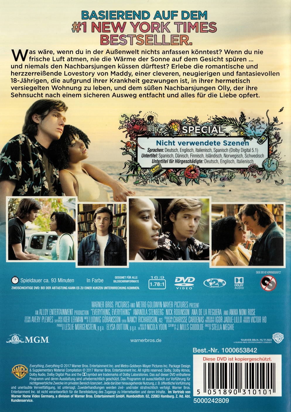 Maddy sehnt sich verzweifelt danach, in der Aussenwelt an- und aufregende Erfahrungen zu sammeln, und sie möchte endlich die Liebe erleben. Obwohl sich Maddy und Olly nur durchs Fenster sehen und über Textnachrichten verständigen können, entwickelt sich zwischen ihnen eine intensive Beziehung – was dazu führt, dass die beiden alles aufs Spiel setzen… selbst wenn sie dadurch alles verlieren sollten.