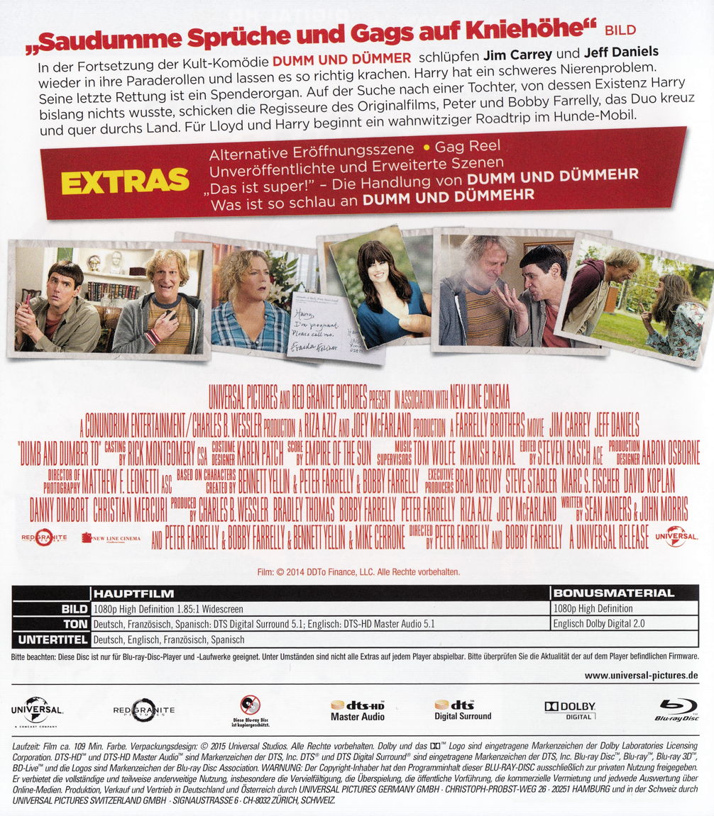 Jim Carrey und Jeff Daniels kehren endlich wieder in ihre Paraderollen als Lloyd und Harry zurück. In der langerwarteten Fortsetzung des Kassenschlagers Dumm und Dümmer werden Lloyd und Harry auf einen Roadtrip geschickt, um Harrys Kind zu finden. Allerdings wäre es wohl besser gewesen, Harry hätte nie von seinem Nachwuchs erfahren und auch noch die Verantwortung dafür bekommen….