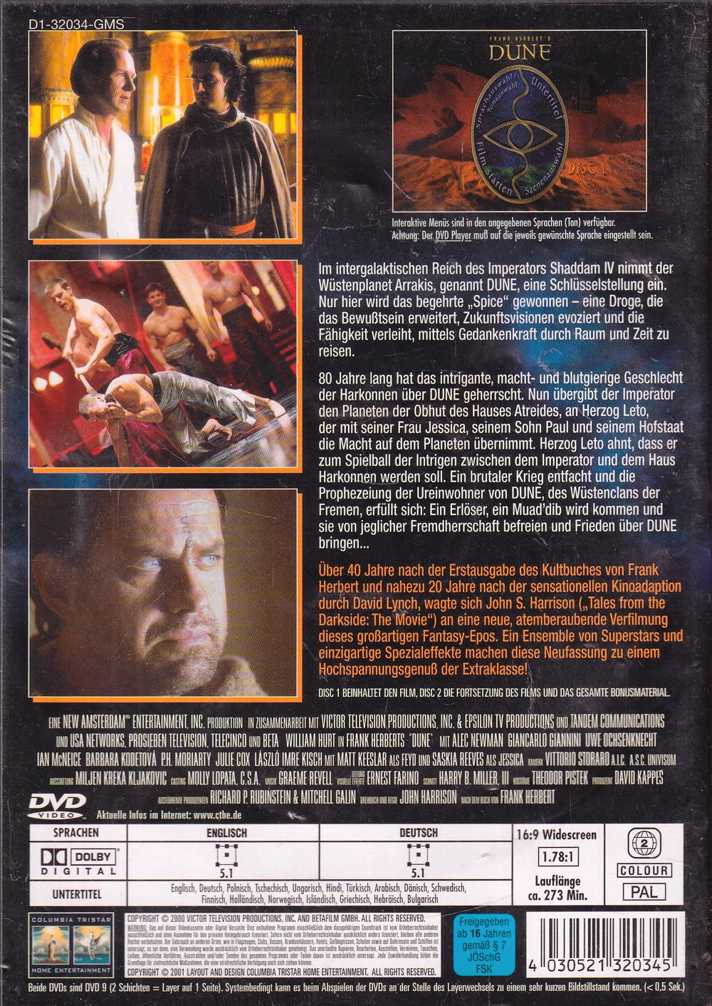 3 Episoden auf 2 DVDs + Bonusmaterial Im intergalaktischen Reich des Imperators Shaddam VI nimmt der Wüstenplanet Arrakis, genannt DUNE, eine Schlüsselstellung ein. Nur hier wird das begehrte "Spice" gewonnen - eine Droge, die das Bewusstsein erweitert, Zukunftsvisionen evoziert und die Fähigkeit verleiht, mittels Gedankenkraft durch Raum und Zeit zu reisen. 80 Jahre lang hat das intrigante, macht- und blutgierige Geschlecht der Harkonnen über DUNE geherrscht. Nun übergibt der Imperator den Planeten der Obhut des Hauses Atreides, an Herzog Leto, der mit seiner Frau Jessica, seinem Sohn Paul und seinem Hofstaat die Macht auf dem Planeten übernimmt. Herzog Leto ahnt, dass er zum Spielball der Intrigen zwischen dem Imperator und dem Haus Harkonnen werden soll. Ein brutaler Krieg entfacht und die Prophezeiung der Ureinwohner von DUNE, des Wüstenclans der Fremen, erfüllt sich: Ein Erlöser, ein Muad'dib wird kommen und sie von jeglicher Fremdherrschaft befreien und Frieden über DUNE bringen.
