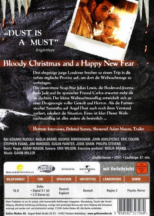 Drei ehrgeizige junge Londoner brechen zu einem Trip in die tiefste englische Provinz auf, um dort die Weihnachtstage zu verbringen. Der umstrittene Soap-Star Julian Lewis, die Boulevard-Journalistin Jade und ihr spanischer Freund Carlos erwartet mehr als sie dachten. Der kleine Weihnachtsausflug entwickelt sich zu einer Drogenorgie voller Gewalt und Horror. Als die Farmerstochter Samantha auf Angel Dust auch noch ihren Verstand verliert, eskaliert die Situation. Eines ist klar: Dieser Weihnachtsausflug ist alles andere als besinnlich...