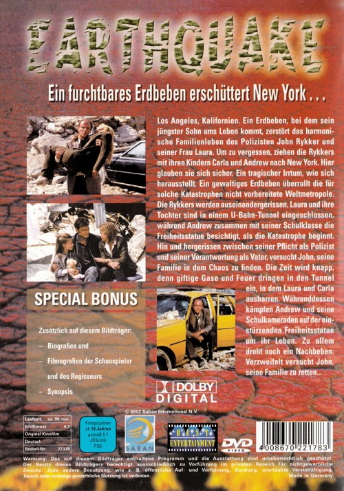 Los Angeles, Kalifornien. Ein Erdbeben, bei dem sein jüngster Sohn ums Leben kommt, zerstört das harmonische Familienleben des Polizisten John Rykker und seiner Frau Laura. Um zu vergessen, ziehen die Rykkers mit ihren Kindern Carla und Andrew nach New York. Hier glauben sie sich sicher. Ein tragischer Irrtum, wie sich herausstellt. Ein gewaltiges Erdbeben überrollt die für solche Katastrophen nicht vorbereitete Weltmetropole. Die Rykkers werden auseinandergerissen. Laura und ihre Tochter sind in einem U-Bahn-Tunnel eingeschlossen, während Andrew zusammen mit seiner Schulklasse die Freiheitsstatue besichtigt, als die Katastrophe beginnt. Hin und hergerissen zwischen seiner Pflicht als Polizist und seiner Verantwortung als Vater, versucht John, seine Familie in dem Chaos zu finden. Die Zeit wird knapp, denn giftige Gase und Feuer dringen in den Tunnel ein, in dem Laura und Carla ausharren. Währenddessen kämpfen Andrew und seine Schulkameraden auf der einstürzenden Freiheitsstatue um ihr Leben. Zu allem droht noch ein Nachbeben. Verzweifelt versucht John, seine Familie zu retten...