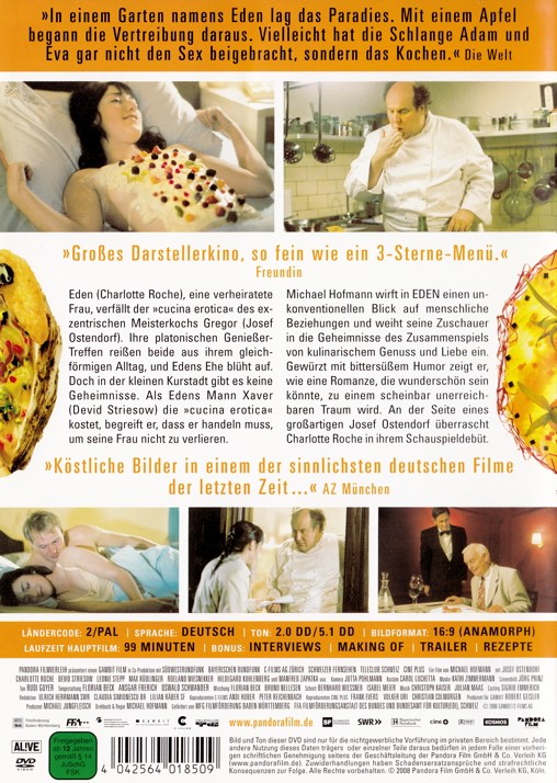 Eden, eine verheiratete Frau, verfällt der "Cucina erotica" des exzentrischen Meisterkochs Gregor. Ihre platonischen Genießer-Treffen reißen beide aus ihrem gleichförmigen Alltag und Edens Ehe blüht auf. Doch in der kleinen Kurstadt gibt es keine Geheimnisse. Als Edens Mann Xaver die cucina erotica kostet, begreift er, dass er handeln muss, um seine Frau nicht zu verlieren. Michael Hofmann wirft in Eden einen unkonventionellen Blick auf menschliche Beziehungen und weiht seine Zuschauer in die Geheimnisse des Zusammenspiels von kulinarischem Genuss und Liebe ein. Gewürzt mit bittersüßem Humor zeigt er, wie eine Romanze, die wunderschön sein könnte, zu einem scheinbar unerreichbaren Traum wird.