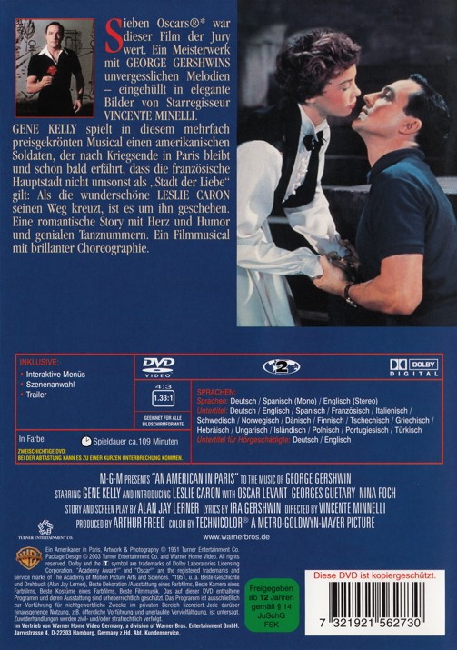 Gene Kelly. Produzent Arthur Freed. Regisseur Vincente Minelli und ein hoch qualifiziertes Produktionsteam zauberten Unterhaltung, die Jahrzehnte überdauert. Kelly spielt einen ehemaligen amerikanischen Soldaten, der Paris und eine reizende (aber verlobte) Parfümerie-Verkäuferin (Leslie Caron in ihrem hinreissenden Filmdebüt) liebt. Zu den Songs der Gershwins wurden umwerfende Tanzszenen choreografiert. Und das Schlussballett - das George Gershwins Titelstück, impressionistische Sets und Kellys unvergleichliches Talent, eine Geschichte tanzend zu erzählen, kombiniert - macht dieses mit sechs Oscars, darunter für den Besten Film) ausgezeichnete Meisterwerk unvergänglich.
