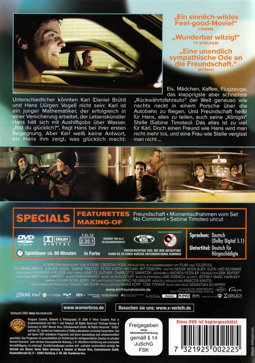 Unterschiedlicher könnten Karl und Hans nicht sein: Karl ist ein junger Mathematiker, der erfolgreich in einer Versicherung arbeitet, der Lebenskünstler Hans hält sich mit Aushilfsjobs über Wasser. "Bist du glücklich?", fragt Hans bei ihrer ersten Begegnung. Aber Karl weiß keine Antwort, bis Hans ihm zeigt, was glücklich macht: Eis, Mädchen, Kaffee, Flugzeuge, das klapprigste aber schnellste "Rückwärtsfahrauto" der Welt genauso wie nachts nackt in einem Porsche über die Autobahn zu fliegen. Und Freundschaft heißt für Hans, alles zu teilen, auch seine "Königin" Stelle. Das alles ist zu viel für Karl. Doch einen Freund wie Hans wird man nicht mehr los, und eine Frau wie Stelle vergisst man nicht...