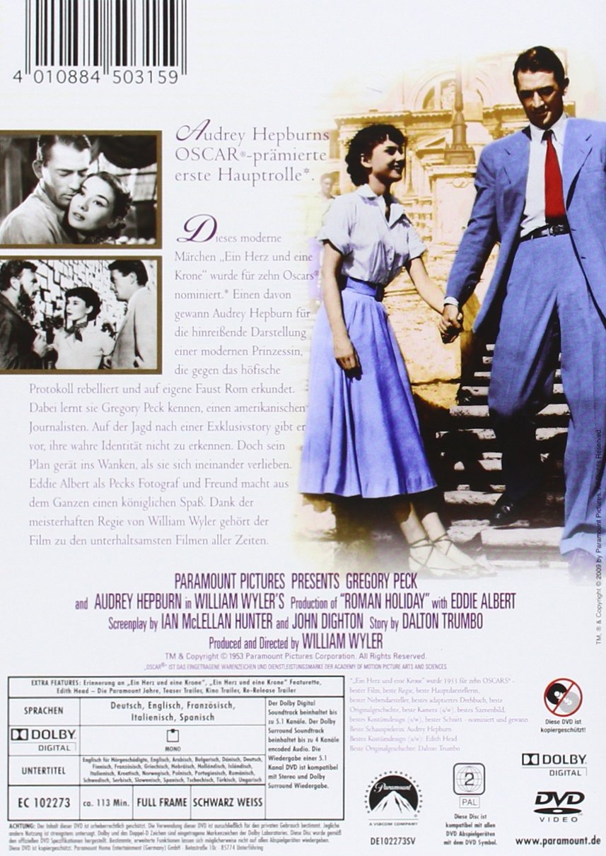 Dieses moderne Märchen "Ein Herz und eine Krone" wurde für zehn Oscars nominiert. Einen davon gewann Audrey Hepburn für die hinreissende Darstellung einer modernen Prinzessin, die gegen das höfische Protokoll rebelliert und auf eigene Faust Rom erkundet. Dabei lernt sie Gregory Peck kennen, einen amerikanischen Journalisten. Auf der Jagd nach einer Exklusiv-Story gibt er vor ihre wahre Identität nicht zu erkennen. Doch sein Plan gerät ins Wanken, als sie sich ineinander verlieben. Eddie Albert als Pecks Fotograf und Freund macht ausdem Ganzen einen königlichen Spass. Dank der meisterhaften Regie von William Wyler, gehört der Film zu den unterhaltsamsten Filmen aller Zeiten.