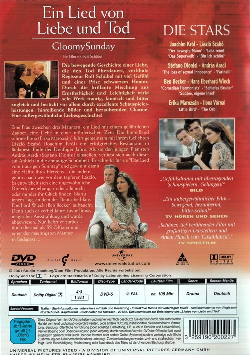Eine Frau zwischen drei Männern, ein Lied mit einem gefährlichen Zauber, eine Liebe in einer mörderischen Zeit: Die hinreissend schöne Ilona führt gemeinsam mit ihrem Geliebten Laszlo Szabo ein erfolgreiches Restaurant in Budapest, Ende der Dreissiger Jahre. Als sie den jungen Pianisten Andras Aradi einstellen, verliebt sich auch dieser auf Anhieb in die anmutige Schönheit. Er schreibt für sie "Das Lied vom traurigen Sonntag" und gewinnt damit eine Hälfte ihres Herzens - die andere gehört nach wie vor dem tapferen Laszlo. Es entwickelt sich eine ungewöhnliche Dreiecksbeziehung, in der alle mehr oder minder ihr Glück finden. Bis zu jenem Tag, an dem der Deutsche Hans-Eberhard Wieck auftaucht. Denn auch er verfiel Jahre zuvor Ilonas magischer Ausstrahlung und wurde abgewiesen. Nun kehrt er zurück - doch diesmal als SS-Offizier und einer der mächtigsten Männer in Budapest...