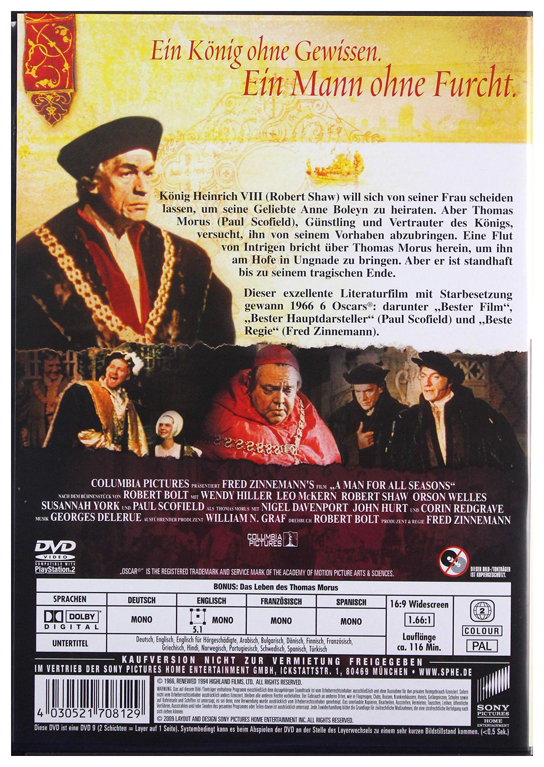 König Heinrich der VIII. (Robert Shaw) will sich von seiner Frau scheiden lassen, um seine Geliebte Anne Boleyn zu heiraten. Aber Thomas More (Paul Scofield), Günstling und Vertrauter des Königs, versucht ihn von seinem Vorhaben abzubringen. Eine Flut von Intrigen bricht über Thomas Moore herein, um ihn am Hofe in Ungnade zu bringen. Aber er ist standhaft bis zu seinem tragischen Ende. Dieser exzellente Literaturfilm mit Starbesetzung gewann 6 Oscars: Darunter Bester Film des Jahres, Bester Hauptdarsteller (Paul Scofield) und Beste Regie (Fred Zinnemann).