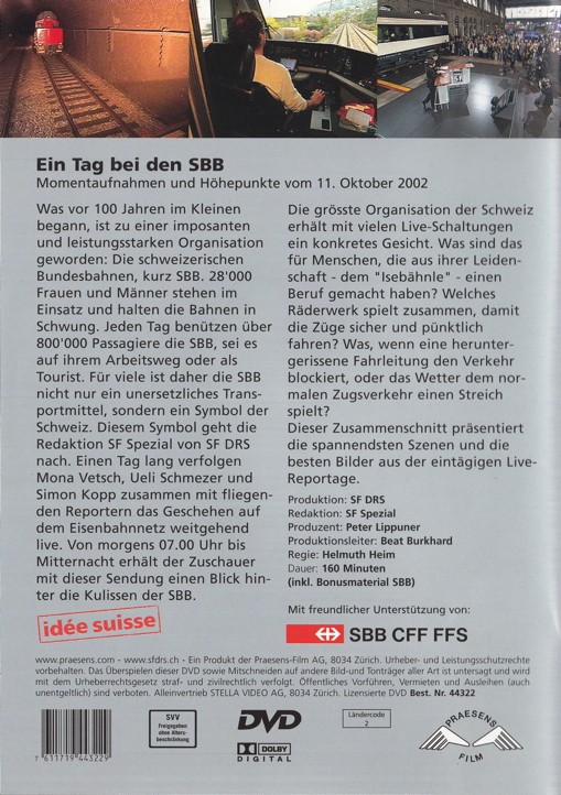 Was vor 100 Jahren im Kleinen begann, ist zu einer imposanten und leistungsstarken Organisation geworden: Die schweizerischen Bundesbahnen, kurz SBB. 28 000 Frauen und Männer stehen im Einsatz und halten die Bahnen in Schwung. Jeden Tag benützen über 800 000 Passagiere die SBB, sei es auf ihrem Arbeitsweg oder als Tourist. Für viele ist daher die SBB nicht nur ein unersetzliches Transportmittel, sondern ein Symbol der Schweiz. Diesem Symbol geht die Redaktion SF Spezial von SF DRS nach. Einen Tag lang verfolgen Mona Vetsch, Ueli Schmezer und Simon Kopp zusammen mit fliegenden Reportern das Geschehen auf dem Eisenbahnnetz weitgehend live. Von morgens 07.00 Uhr bis Mitternacht erhält der Zuschauer mit dieser Sendung einen Blick hinter die Kulissen der SBB.